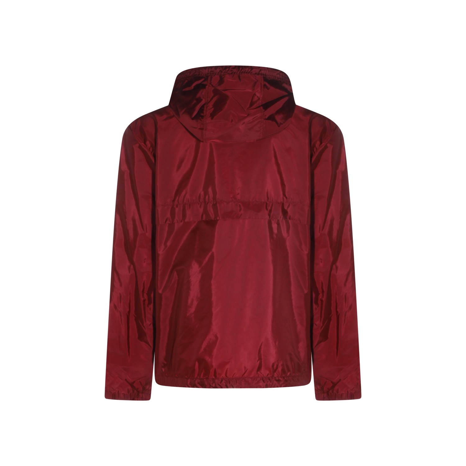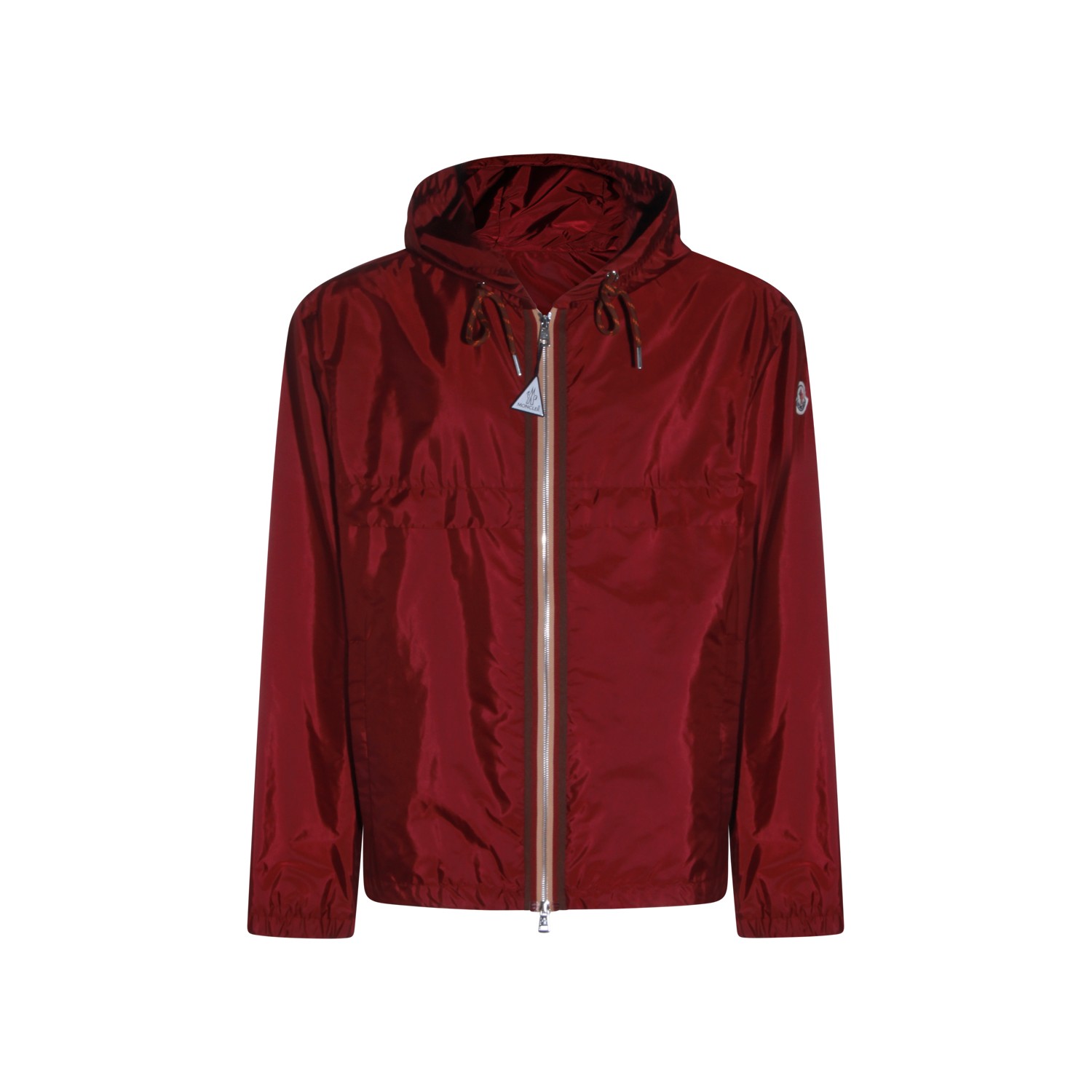 Burgundy Nidge casual jacket from Moncler featuring long sleeves, hoodie, zip closure, logo details and side pockets.
